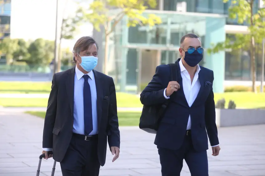 Aníbal Pinto, à direita, na chegada ao julgamento em que é acusado de co-autoria, com Rui Pinto, de tentativa de extorsão à Doyen